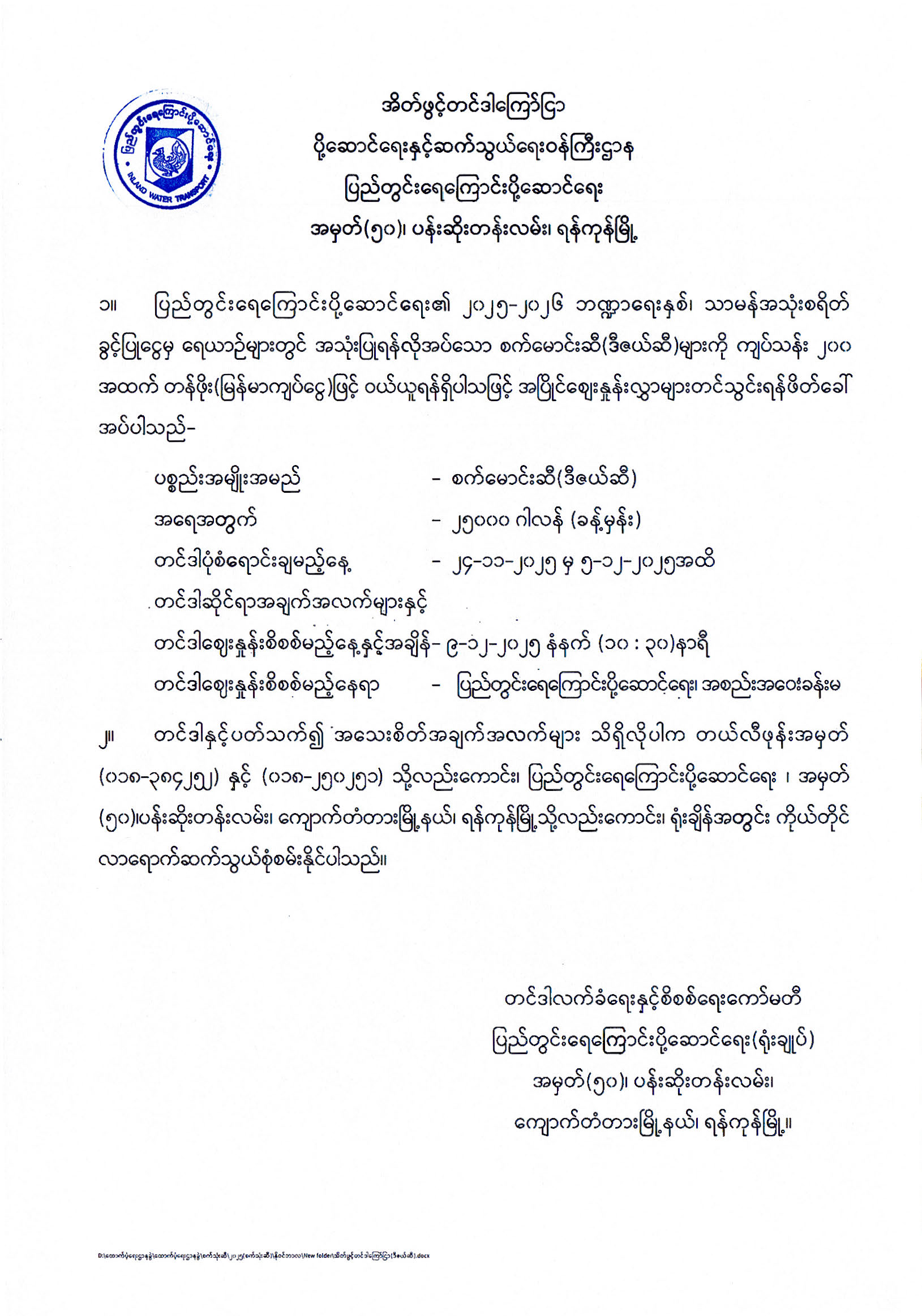 ပြည်တွင်းရေကြောင်းပို့ဆောင်ရေး ၂၀၂၅-၂၀၂၆ ဘဏ္ဍာရေးနှစ် ရေယာဉ်များတွင် အသုံးပြုရန် လိုအပ်သော စက်မောင်းဆီ (ဒီဇယ်ဆီ)(မြန်မာကျပ်ငွေ)ဖြင့် ဝယ်ယူရန်ရှိပါသဖြင့် အပြိုင်ဈေးနှုန်း လွှာများ တင်သွင်းရန်ခေါ်ယူခြင်း